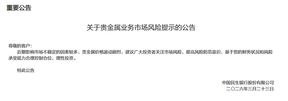 民生银行发布《关于贵金属业务市场风险提示的公告》称,近期影响市场不稳定的因素较多,贵金属价格波动剧烈,建议广大投资者关注市场风险,提高风险防范意识,基于财务状况和风险承受能力合理控制仓位,理性投资。