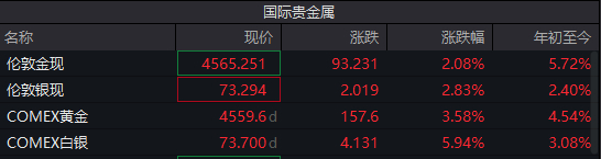 截至发稿,伦敦金现涨2.08%报4565.25美元/盎司;COMEX黄金涨3.58%报4559.6美元/盎司。