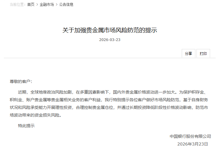 3月23日,中国银行发布《关于加强贵金属市场风险防范的提示》称,近期,全球地缘政治风险加剧,在多重因素影响下,国内外贵金属价格波动进一步加大。为保护积存金、积利金、账户贵金属等贵金属相关业务的客户利益,特别提示各位客户做好市场风险防范,基于自身财务状况和风险承受能力开展理性投资,合理控制贵金属仓位,并通过长期投资降低阶段性价格波动影响,防范市场波动带来的资金损失风险。