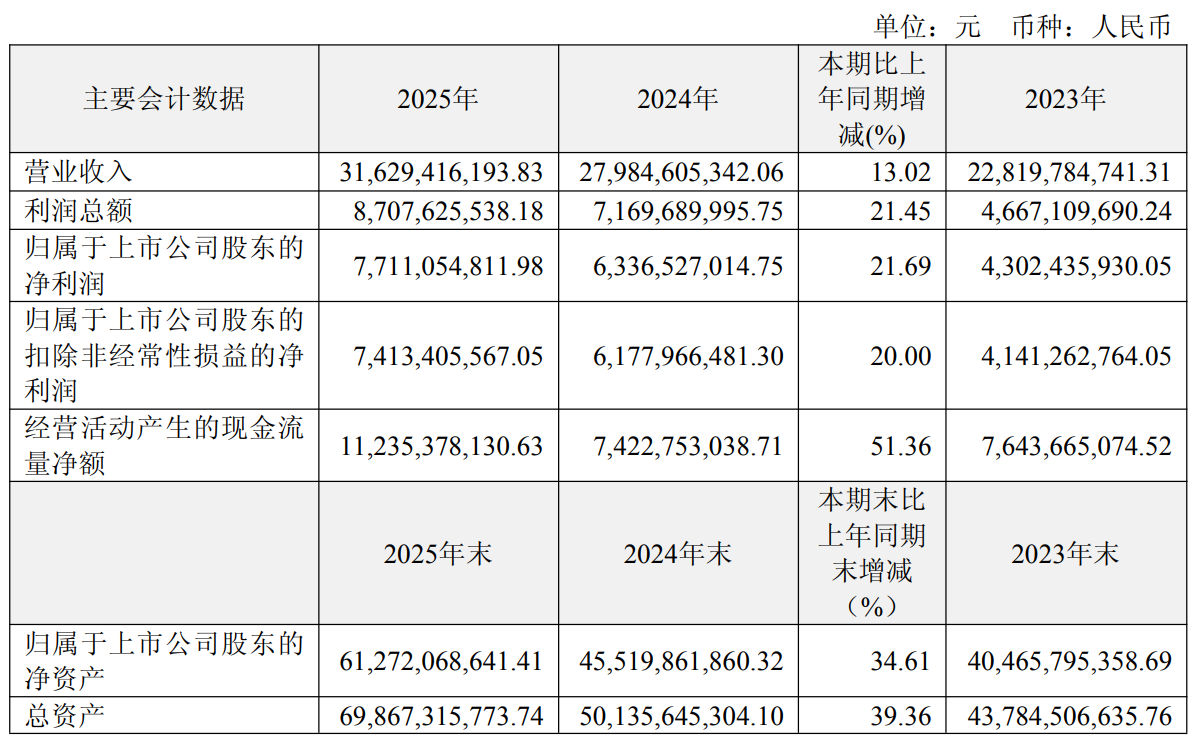 资产重大变化方面,截至2025年末,公司货币资金较上年末增加65.04%,占公司总资产比重上升9.12个百分点;应收票据及应收账款较上年末增加4.22%,占公司总资产比重下降2.55个百分点;固定资产较上年末增加13.61%,占公司总资产比重下降1.89个百分点;应收款项融资较上年末减少42.39%,占公司总资产比重下降1.28个百分点。
