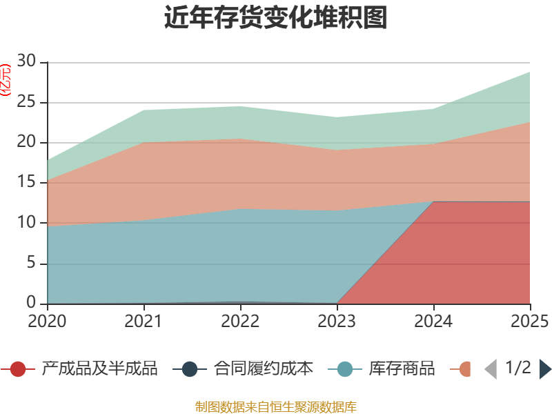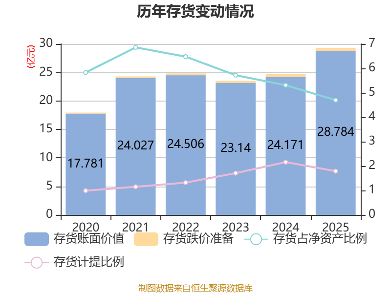 从存货变动来看,截至2025年末,公司存货账面价值为28.78亿元,占净资产的4.7%,较上年末增加4.61亿元。其中,存货跌价准备为5257.03万元,计提比例为1.79%。