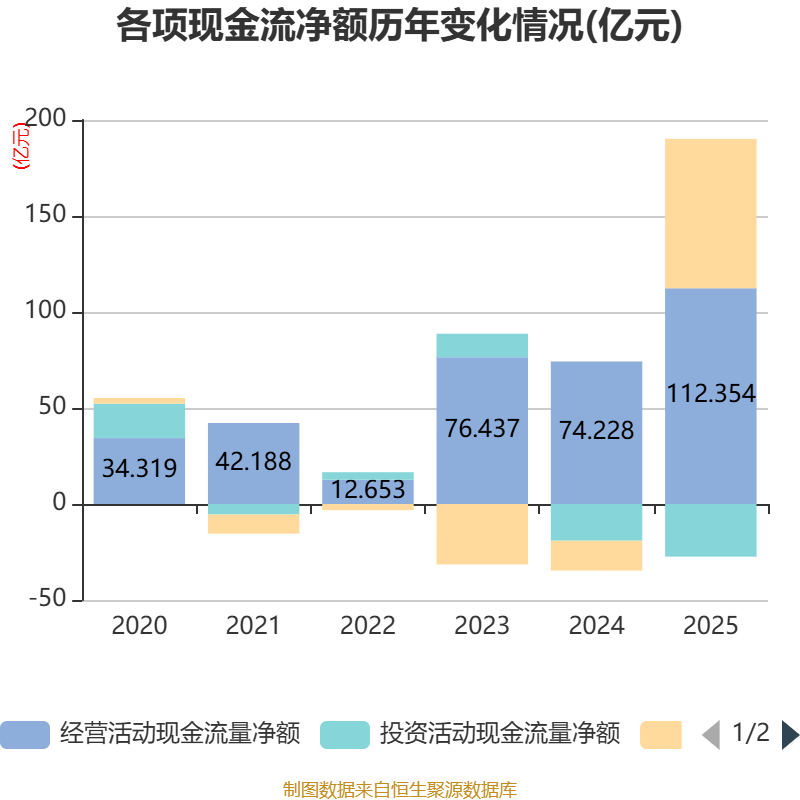 截至2025年,公司经营活动现金流净额为112.35亿元,同比增长51.36%;筹资活动现金流净额77.82亿元,同比增加93.32亿元;投资活动现金流净额-27.41亿元,上年同期为-19.12亿元。