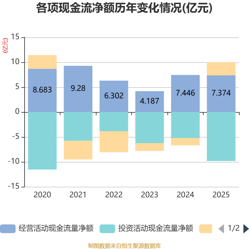 截至2025年,公司经营活动现金流净额为7.37亿元,同比下降0.97%;筹资活动现金流净额2.64亿元,同比增加4.1亿元;投资活动现金流净额-9.82亿元,上年同期为-5.23亿元。