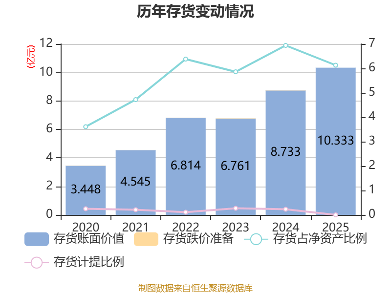 从存货变动来看,截至2025年末,公司存货账面价值为10.33亿元,占净资产的6.13%,较上年末增加1.6亿元。公司本期没有计提存货跌价准备。