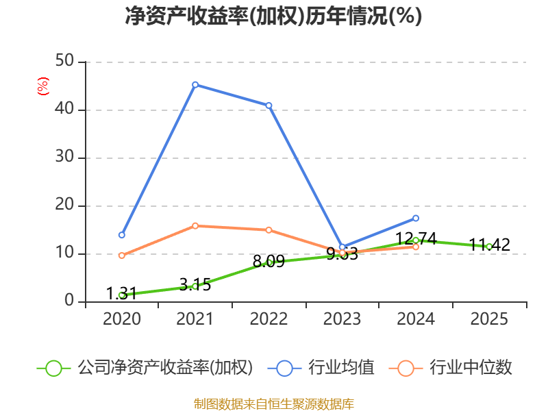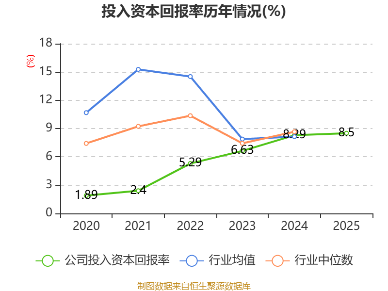 数据显示,2025年公司加权平均净资产收益率为11.42%,较上年同期下降1.32个百分点。公司2025年投入资本回报率为8.5%,较上年同期上升0.21个百分点。