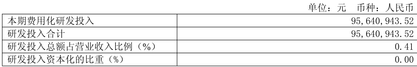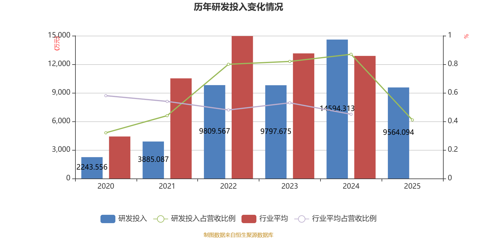 2025年全年,公司研发投入金额为9564.09万元,同比下降34.47%;研发投入占营业收入比例为0.41%,相比上年同期下降0.46个百分点。此外,公司全年研发投入资本化率为0%。