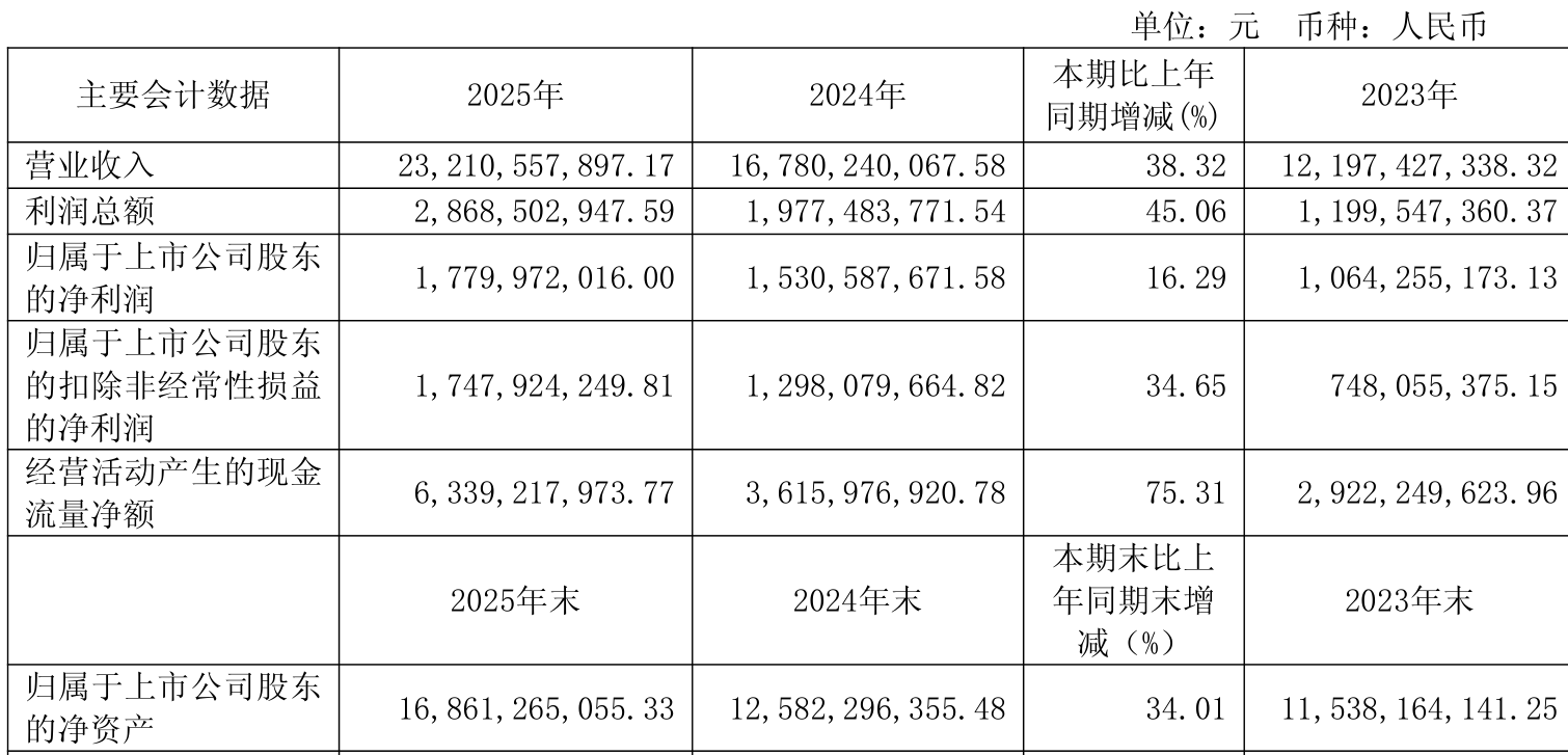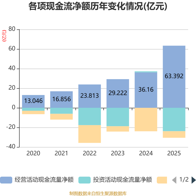截至2025年,公司经营活动现金流净额为63.39亿元,同比增长75.31%;筹资活动现金流净额-6.68亿元,同比增加17.28亿元;投资活动现金流净额-23.89亿元,上年同期为1.04亿元。