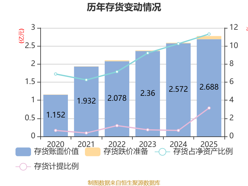 从存货变动来看,截至2025年末,公司存货账面价值为2.69亿元,占净资产的11.32%,较上年末增加1153.64万元。其中,存货跌价准备为869.99万元,计提比例为3.14%。