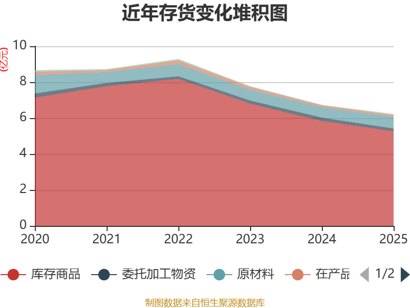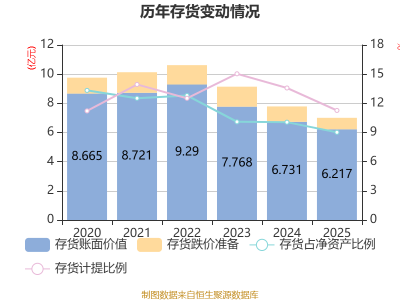 从存货变动来看,截至2025年末,公司存货账面价值为6.22亿元,占净资产的9.02%,较上年末减少5136.75万元。其中,存货跌价准备为7900.22万元,计提比例为11.27%。