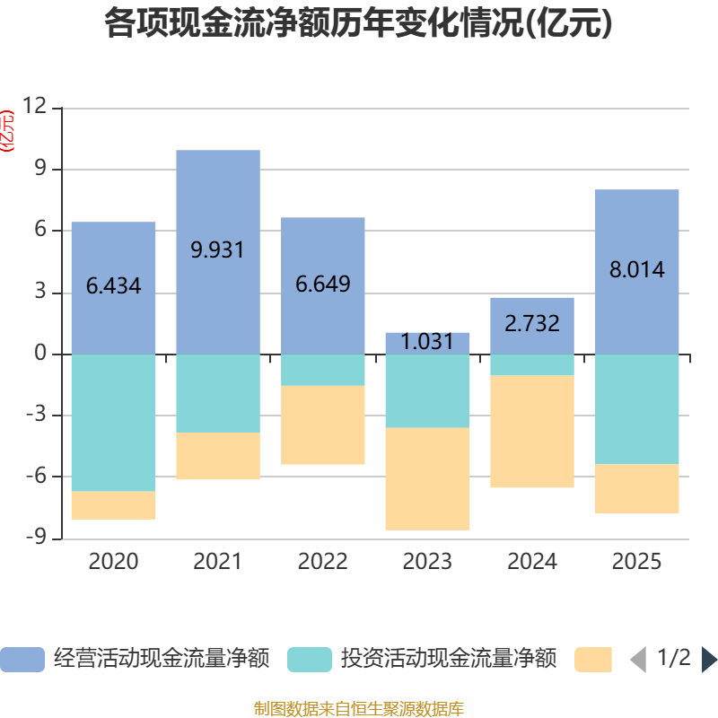 截至2025年,公司经营活动现金流净额为8.01亿元,同比增长193.33%;筹资活动现金流净额-2.4亿元,同比增加3.06亿元;投资活动现金流净额-5.38亿元,上年同期为-1.06亿元。
