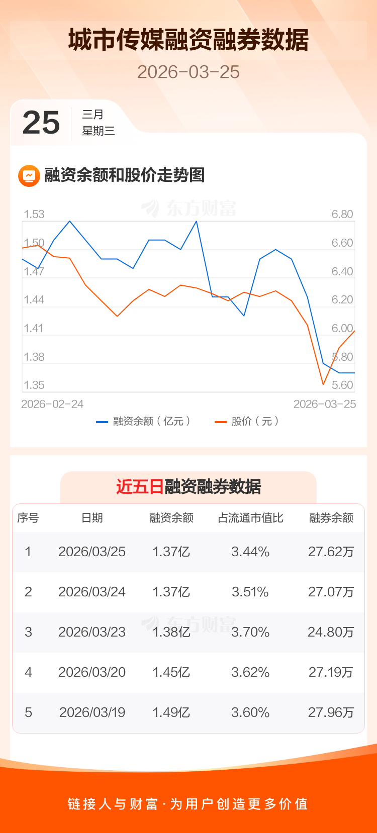 交易所最新数据显示,城市传媒于2026年3月25日获融资买入222.96万元,融资偿还209.15万元,当日融资净买入13.81万元。目前,该股融资余额1.37亿,占流通市值比例为3.44%。