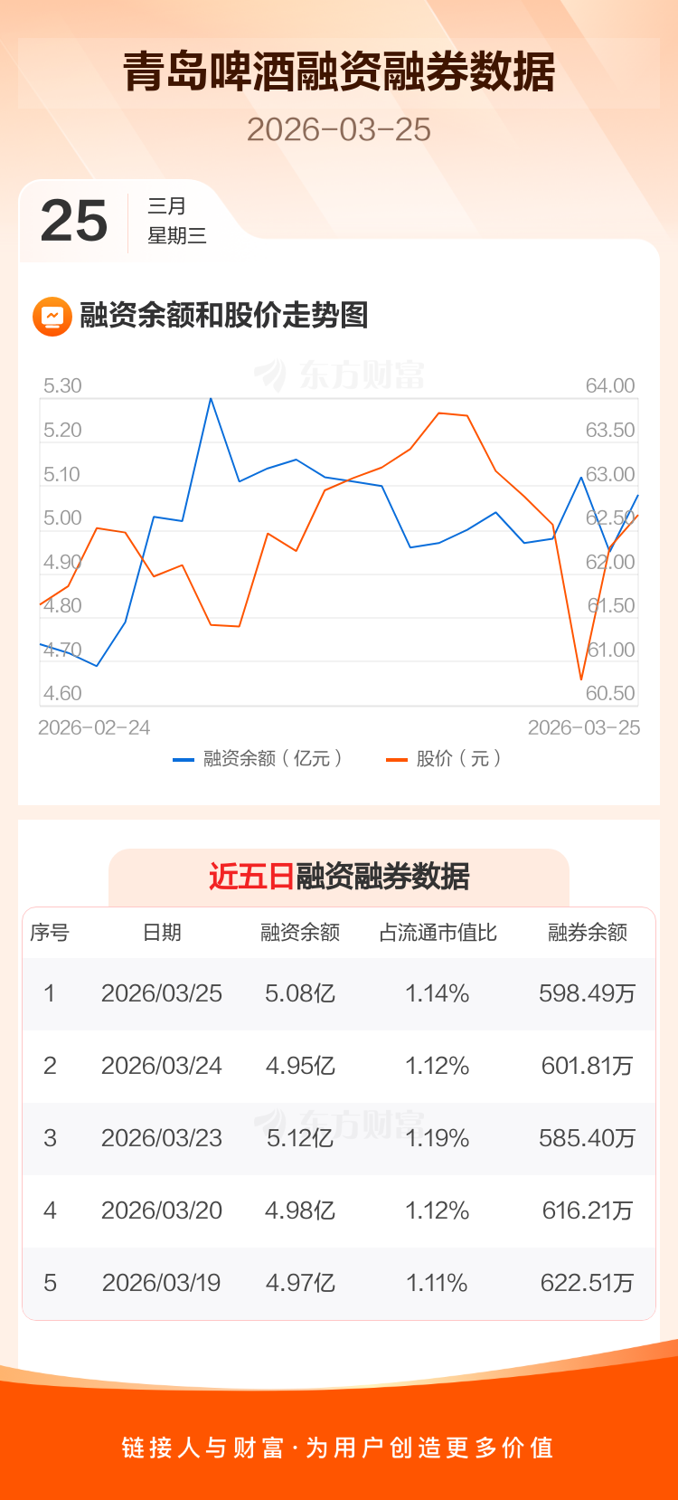 交易所最新数据显示,青岛啤酒于2026年3月25日获融资买入3077.82万元,融资偿还1777.76万元,当日融资净买入1300.06万元。目前,该股融资余额5.08亿,占流通市值比例为1.14%。