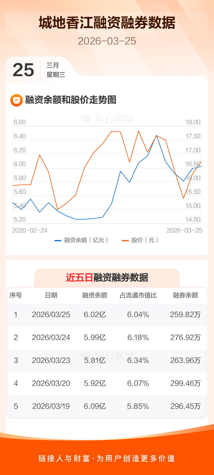 交易所最新数据显示,城地香江于2026年3月25日获融资买入3252.06万元,融资偿还2953.68万元,当日融资净买入298.38万元。目前,该股融资余额6.02亿,占流通市值比例为6.04%。
