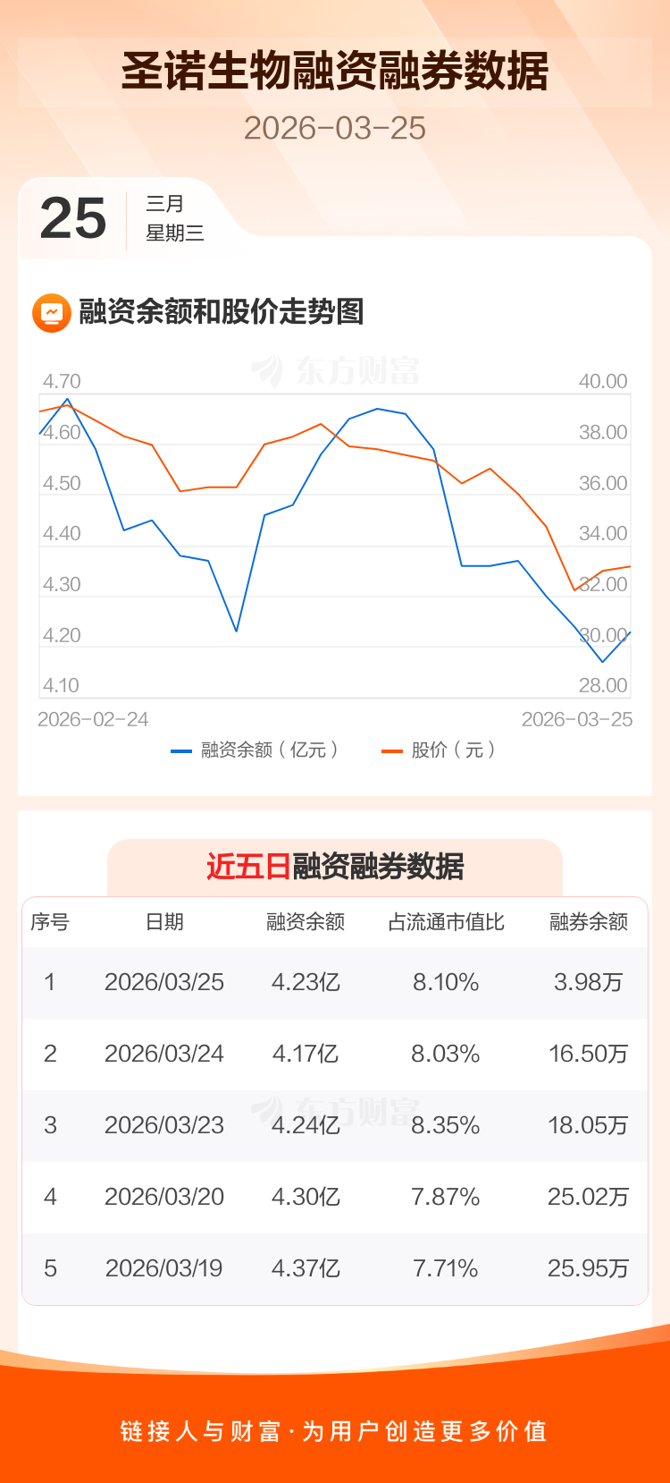 交易所最新数据显示,圣诺生物于2026年3月25日获融资买入1286.89万元,融资偿还719.91万元,当日融资净买入566.97万元。目前,该股融资余额4.23亿,占流通市值比例为8.10%。