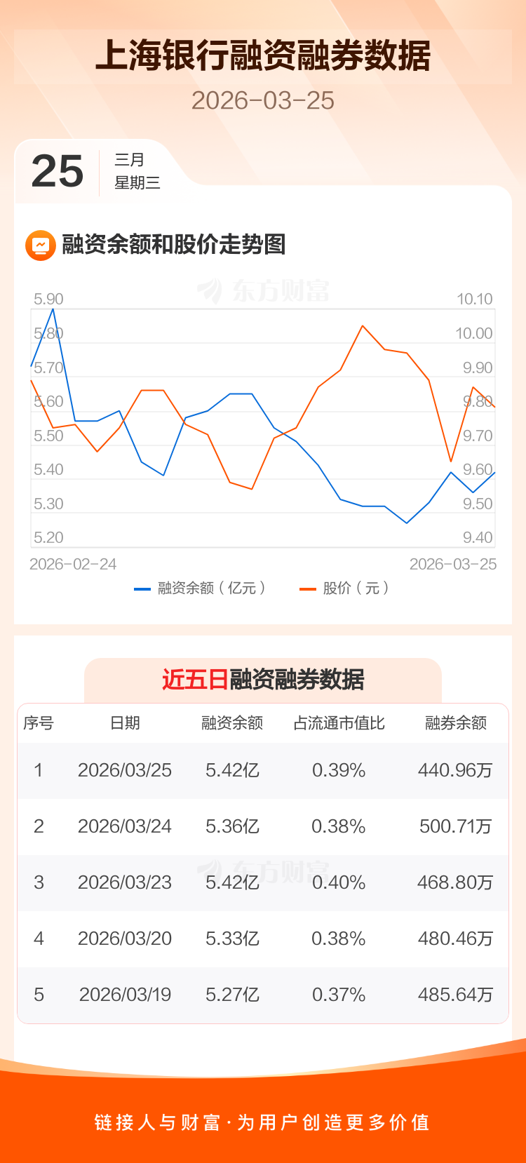 交易所最新数据显示,上海银行于2026年3月25日获融资买入2194.04万元,融资偿还1627.54万元,当日融资净买入566.5万元。目前,该股融资余额5.42亿,占流通市值比例为0.39%。