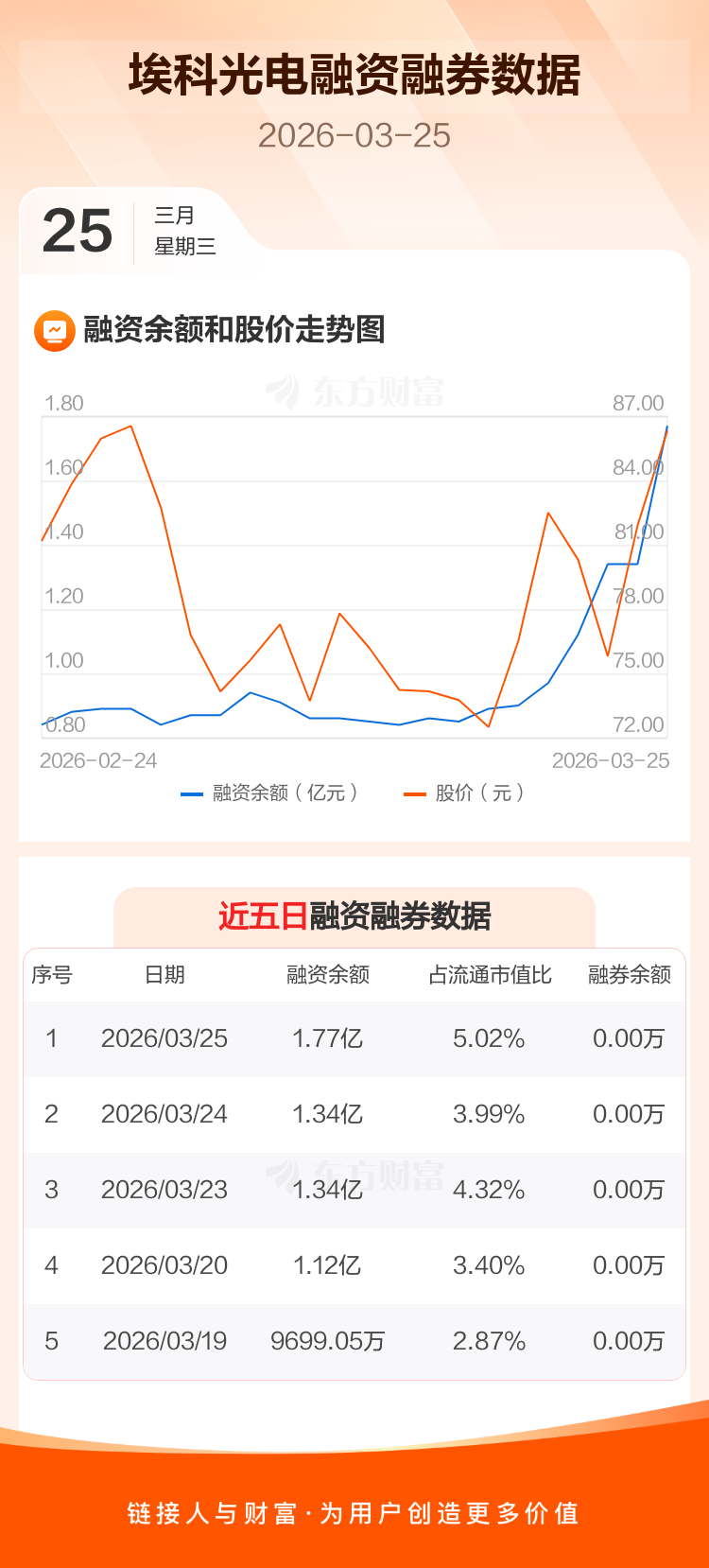 交易所最新数据显示,埃科光电于2026年3月25日获融资买入5917.37万元,融资偿还1579.48万元,当日融资净买入4337.88万元。目前,该股融资余额1.77亿,占流通市值比例为5.02%。