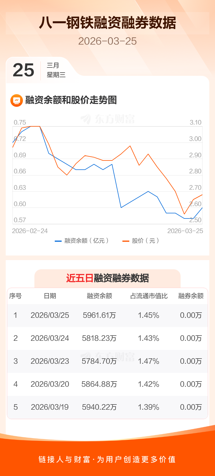 交易所最新数据显示,八一钢铁于2026年3月25日获融资买入217.72万元,融资偿还74.34万元,当日融资净买入143.39万元。目前,该股融资余额5961.61万,占流通市值比例为1.45%。