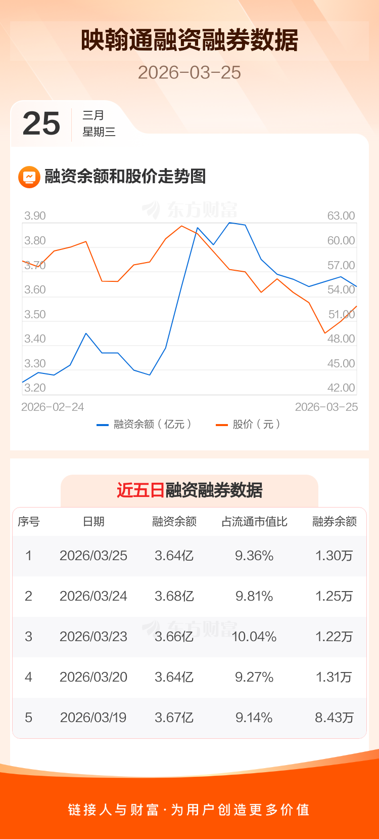交易所最新数据显示,映翰通于2026年3月25日获融资买入1410.56万元,融资偿还1818.31万元,当日融资净偿还407.76万元。目前,该股融资余额3.64亿,占流通市值比例为9.36%。
