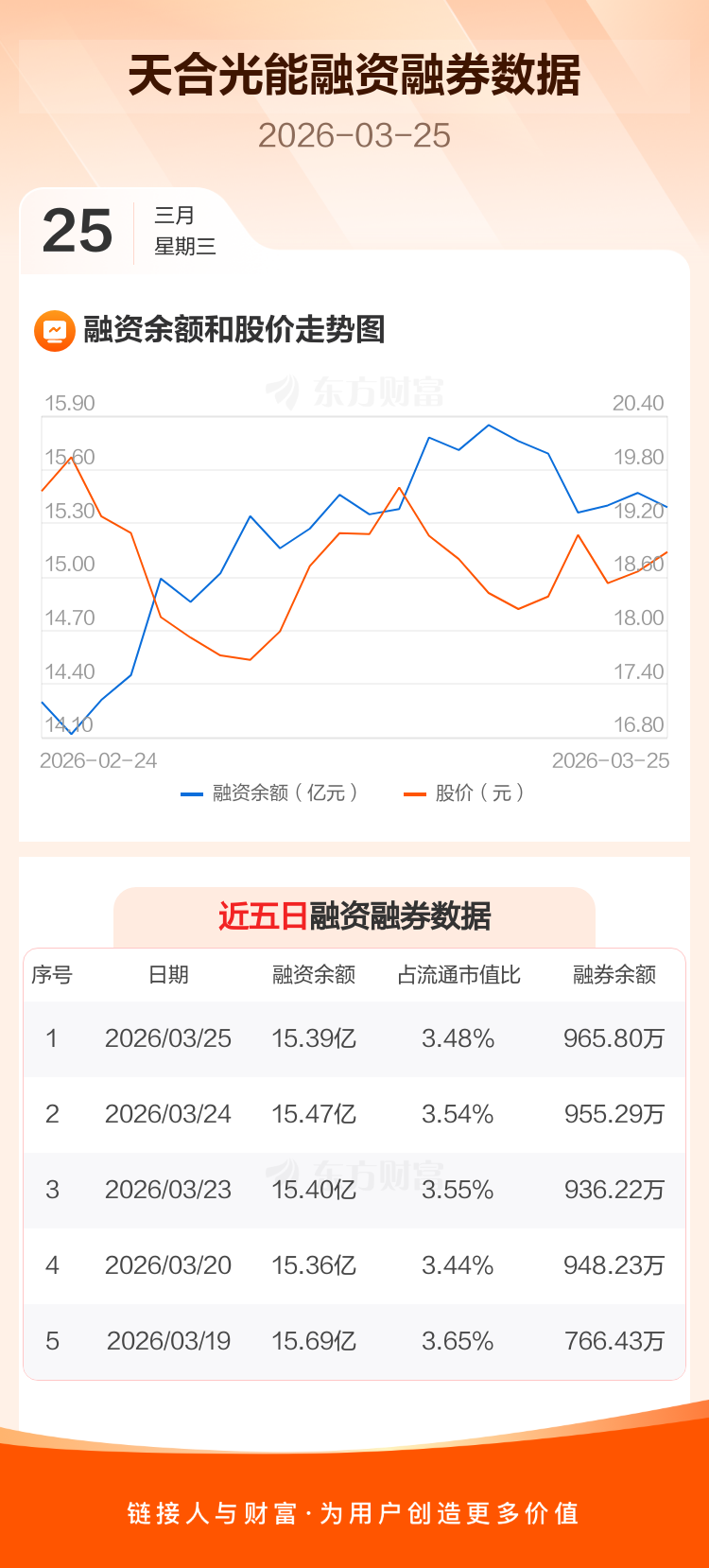 交易所最新数据显示,天合光能于2026年3月25日获融资买入1.14亿元,融资偿还1.22亿元,当日融资净偿还805.31万元。目前,该股融资余额15.39亿,占流通市值比例为3.48%。