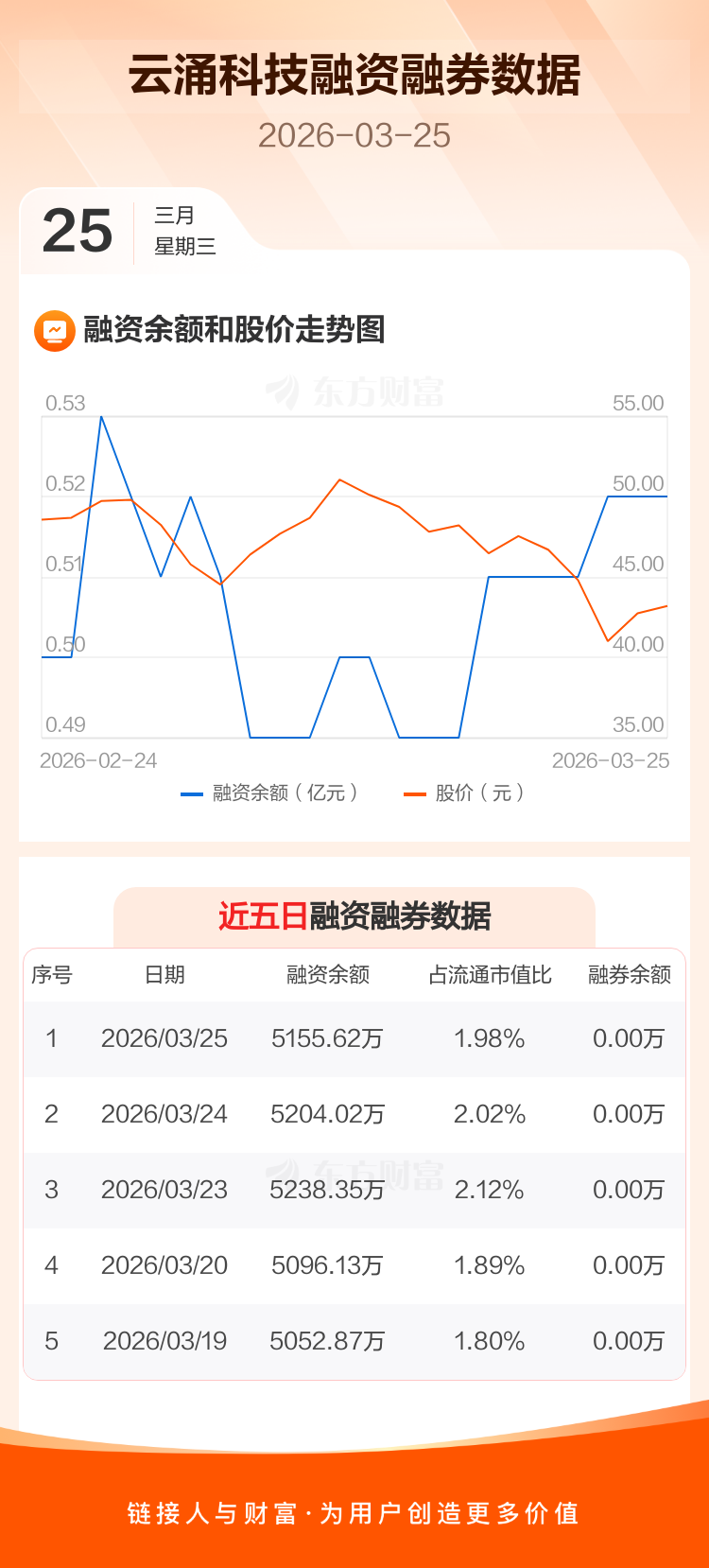 交易所最新数据显示,云涌科技于2026年3月25日获融资买入187.79万元,融资偿还236.19万元,当日融资净偿还48.4万元。目前,该股融资余额5155.62万,占流通市值比例为1.98%。