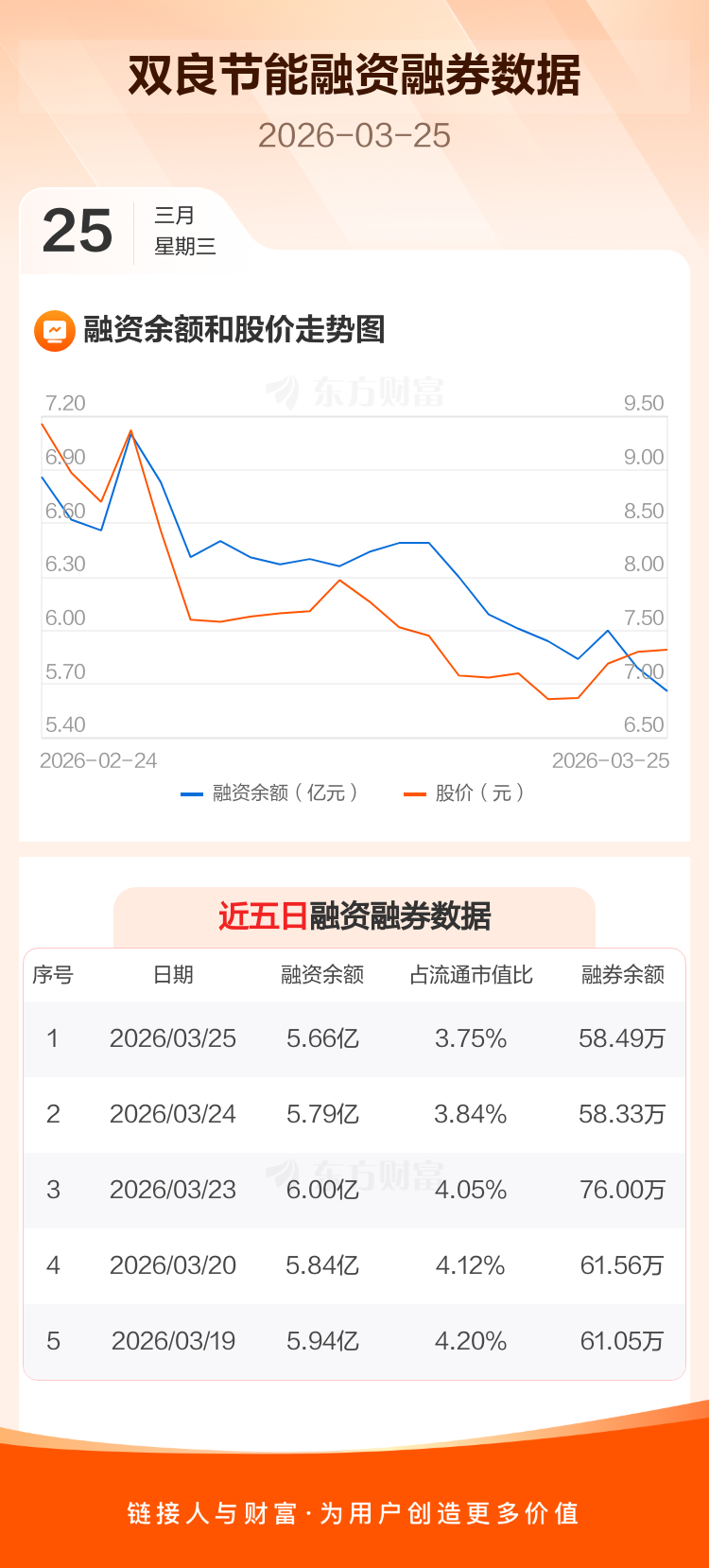 交易所最新数据显示,双良节能于2026年3月25日获融资买入6711.75万元,融资偿还8017.54万元,当日融资净偿还1305.79万元。目前,该股融资余额5.66亿,占流通市值比例为3.75%。