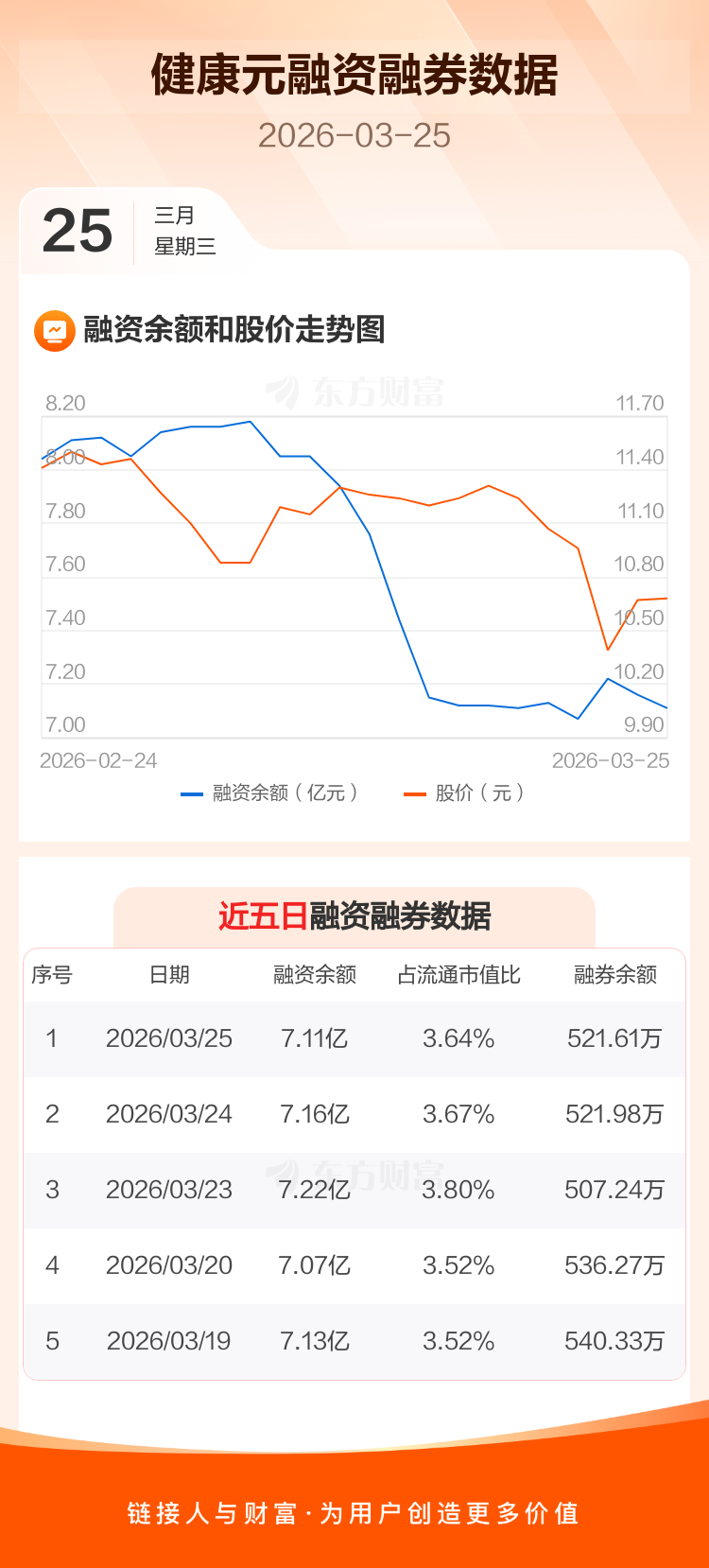 交易所最新数据显示,健康元于2026年3月25日获融资买入712.94万元,融资偿还1200.12万元,当日融资净偿还487.18万元。目前,该股融资余额7.11亿,占流通市值比例为3.64%。