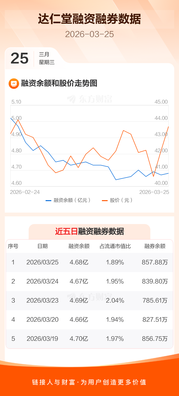 交易所最新数据显示,达仁堂于2026年3月25日获融资买入2147.76万元,融资偿还1972.85万元,当日融资净买入174.91万元。目前,该股融资余额4.68亿,占流通市值比例为1.89%。