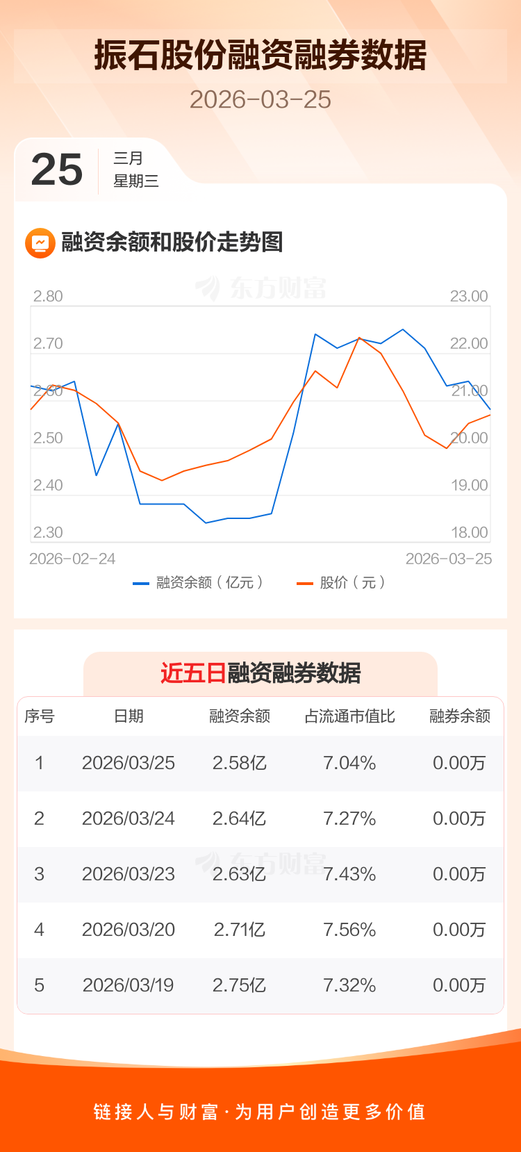 交易所最新数据显示,振石股份于2026年3月25日获融资买入2384.65万元,融资偿还3012.90万元,当日融资净偿还628.26万元。目前,该股融资余额2.58亿,占流通市值比例为7.04%。