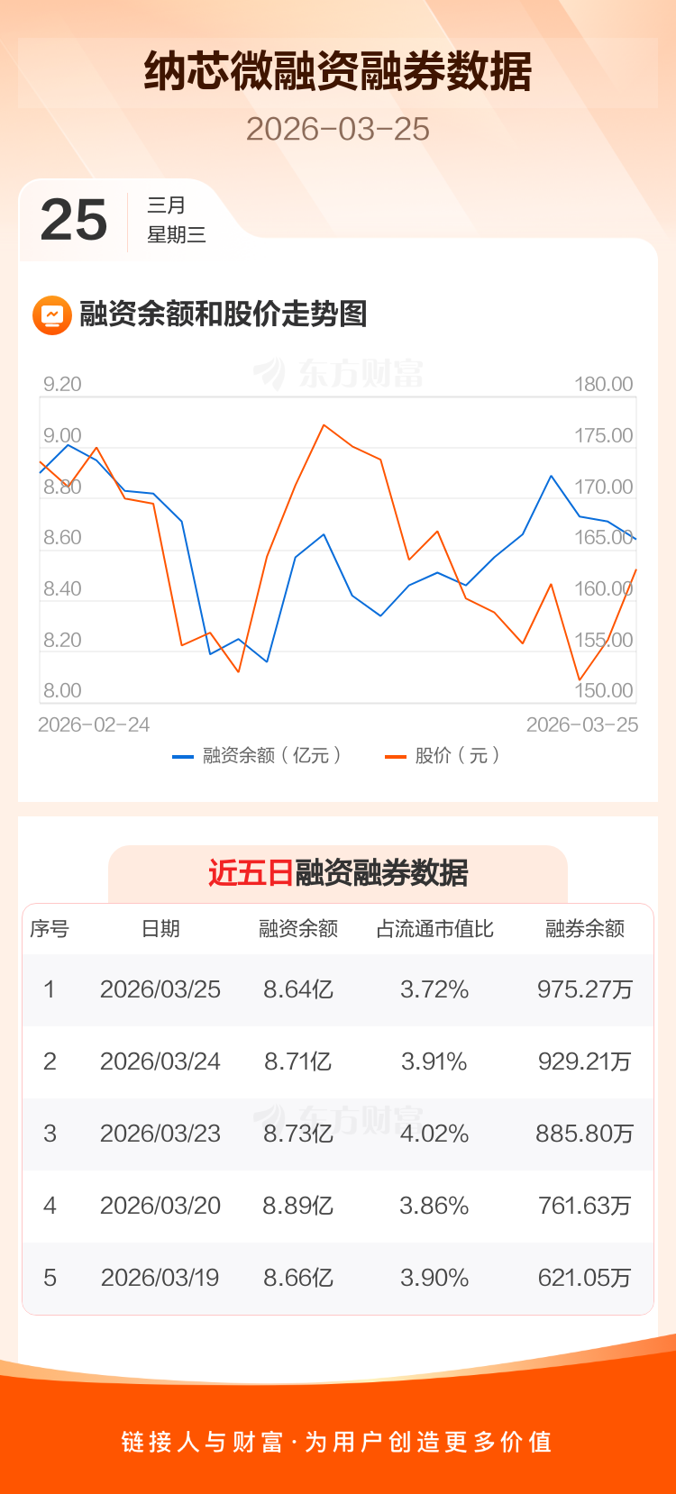 交易所最新数据显示,纳芯微于2026年3月25日获融资买入1688.21万元,融资偿还2347.74万元,当日融资净偿还659.53万元。目前,该股融资余额8.64亿,占流通市值比例为3.72%。