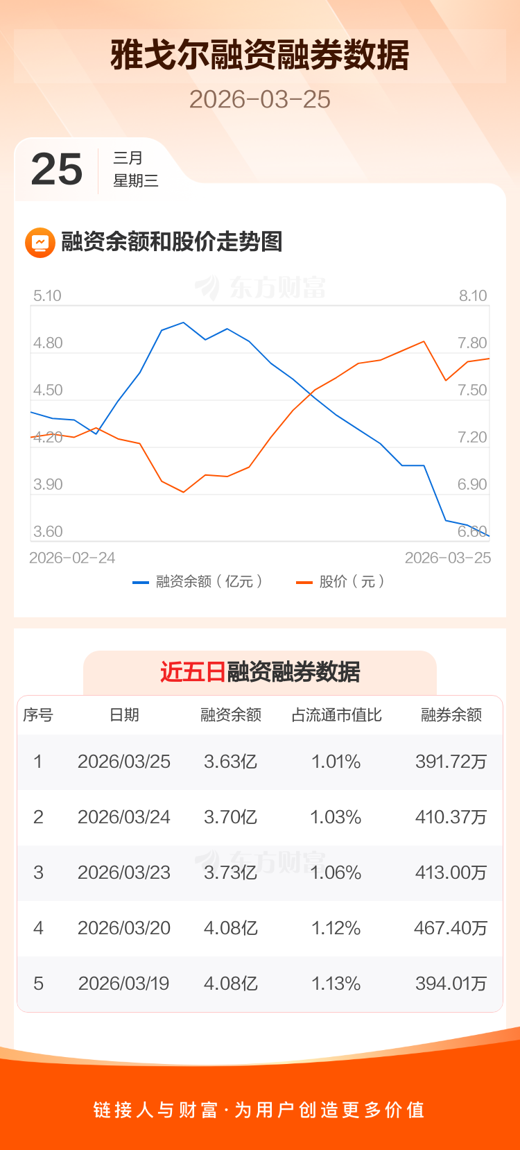 交易所最新数据显示,雅戈尔于2026年3月25日获融资买入1470.24万元,融资偿还2221.88万元,当日融资净偿还751.64万元。目前,该股融资余额3.63亿,占流通市值比例为1.01%。
