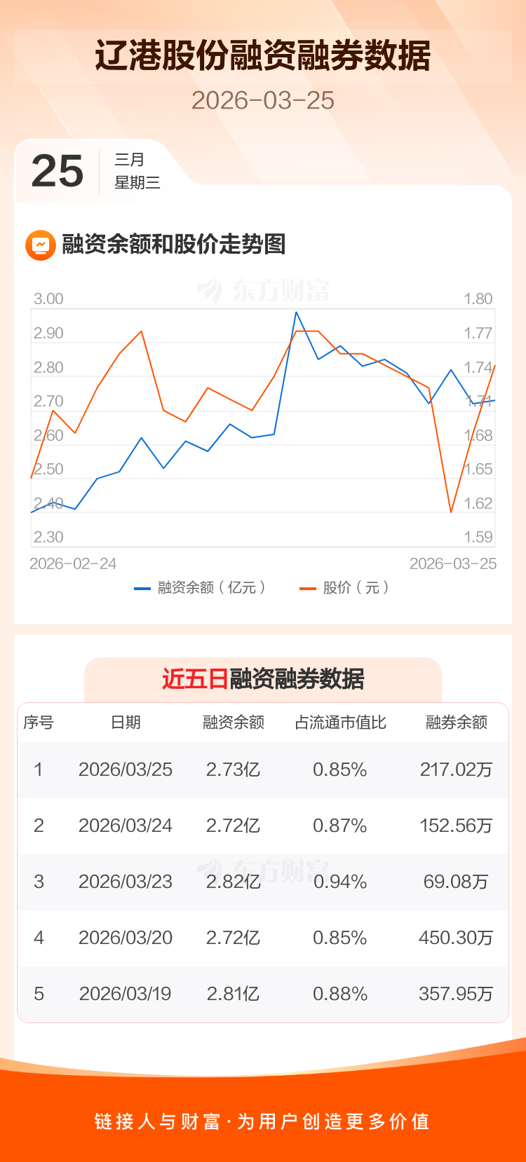 交易所最新数据显示,辽港股份于2026年3月25日获融资买入2918.97万元,融资偿还2817.50万元,当日融资净买入101.47万元。目前,该股融资余额2.73亿,占流通市值比例为0.85%。