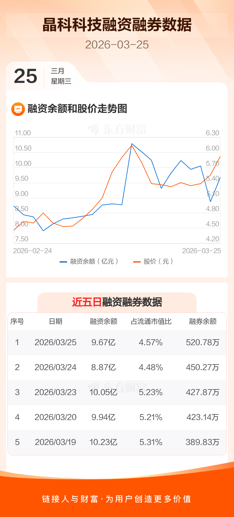 交易所最新数据显示,晶科科技于2026年3月25日获融资买入3.05亿元,融资偿还2.26亿元,当日融资净买入7941.32万元。目前,该股融资余额9.67亿,占流通市值比例为4.57%。