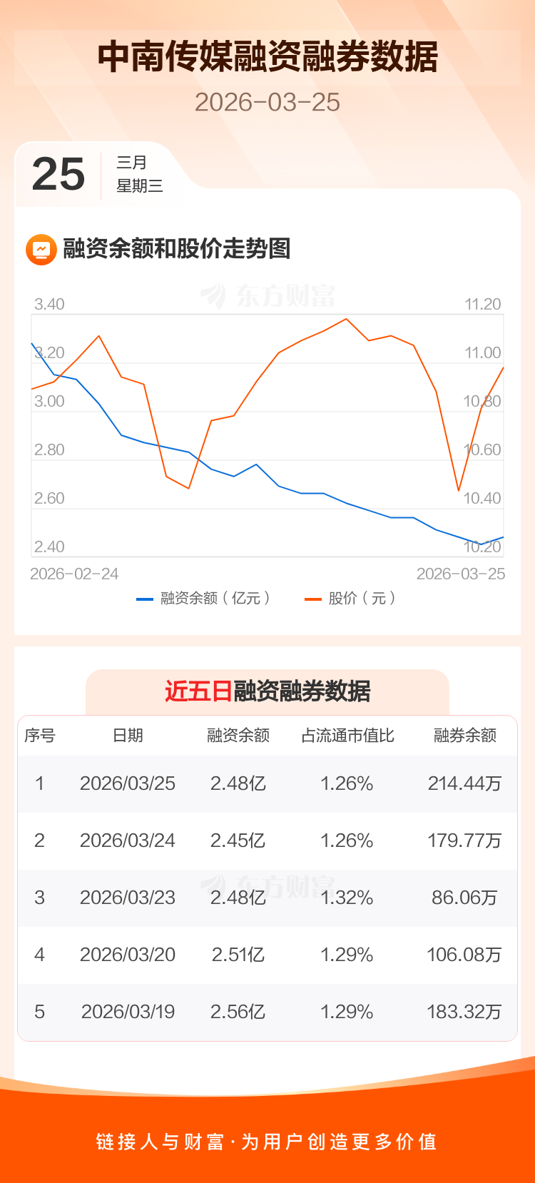 交易所最新数据显示,中南传媒于2026年3月25日获融资买入1181.55万元,融资偿还838.34万元,当日融资净买入343.21万元。目前,该股融资余额2.48亿,占流通市值比例为1.26%。