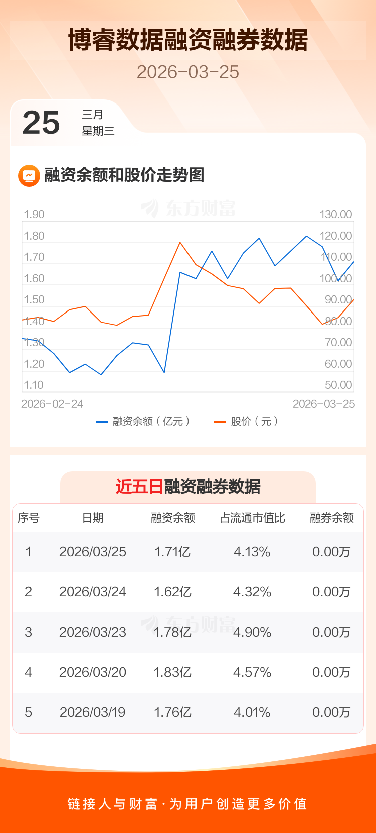 交易所最新数据显示,博睿数据于2026年3月25日获融资买入5364.08万元,融资偿还4522.02万元,当日融资净买入842.05万元。目前,该股融资余额1.71亿,占流通市值比例为4.13%。