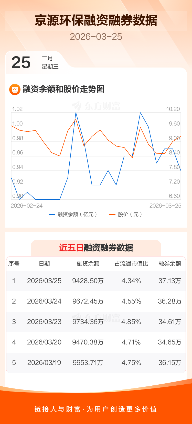 交易所最新数据显示,京源环保于2026年3月25日获融资买入632.72万元,融资偿还876.67万元,当日融资净偿还243.95万元。目前,该股融资余额9428.50万,占流通市值比例为4.34%。
