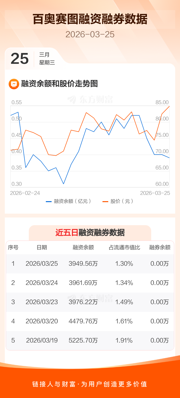 交易所最新数据显示,百奥赛图于2026年3月25日获融资买入941.32万元,融资偿还953.45万元,当日融资净偿还12.13万元。目前,该股融资余额3949.56万,占流通市值比例为1.30%。