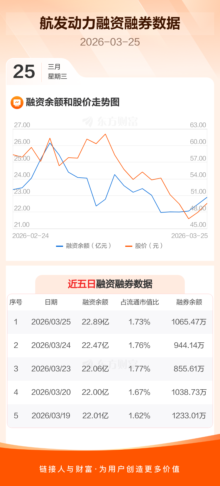 交易所最新数据显示,航发动力于2026年3月25日获融资买入1.98亿元,融资偿还1.56亿元,当日融资净买入4194.82万元。目前,该股融资余额22.89亿,占流通市值比例为1.73%。