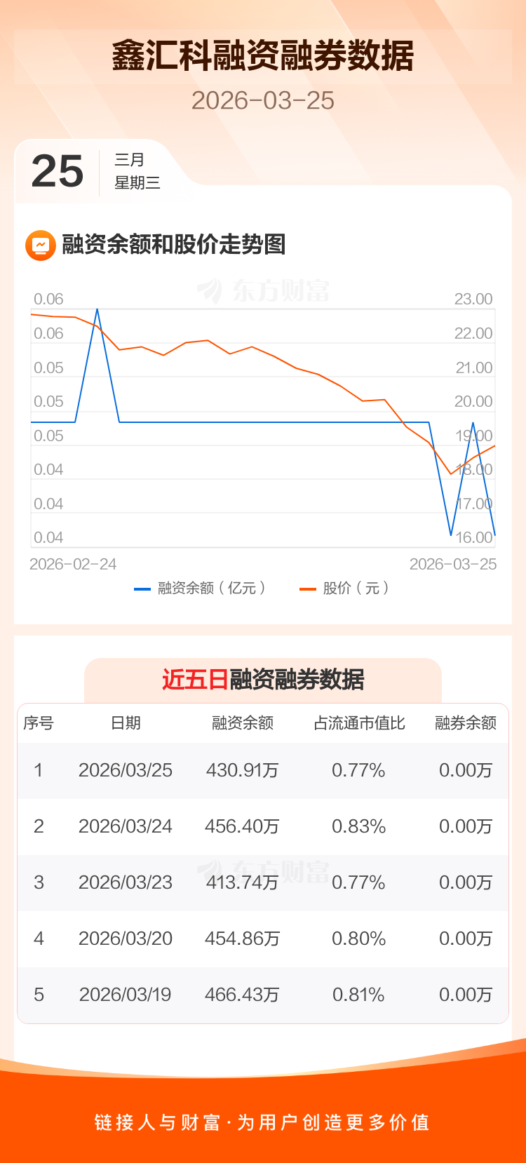 鑫汇科:融资净偿还25.49万元,融资余额430.91万元
