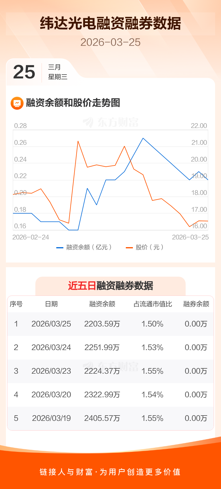 交易所最新数据显示,纬达光电于2026年3月25日获融资买入178.83万元,融资偿还227.23万元,当日融资净偿还48.4万元。目前,该股融资余额2203.59万,占流通市值比例为1.50%。