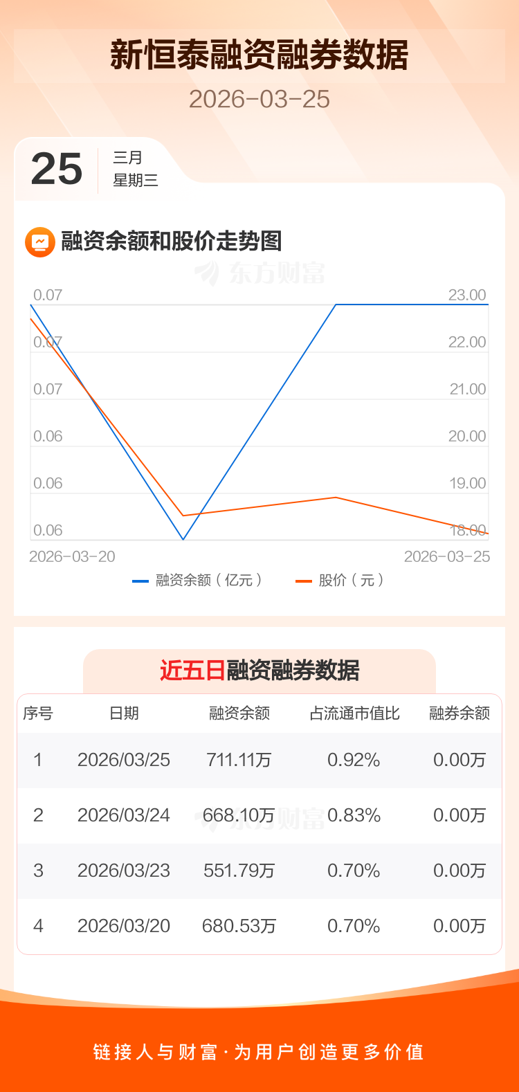 交易所最新数据显示,新恒泰于2026年3月25日获融资买入280.67万元,融资偿还237.66万元,当日融资净买入43.01万元。目前,该股融资余额711.11万,占流通市值比例为0.92%。