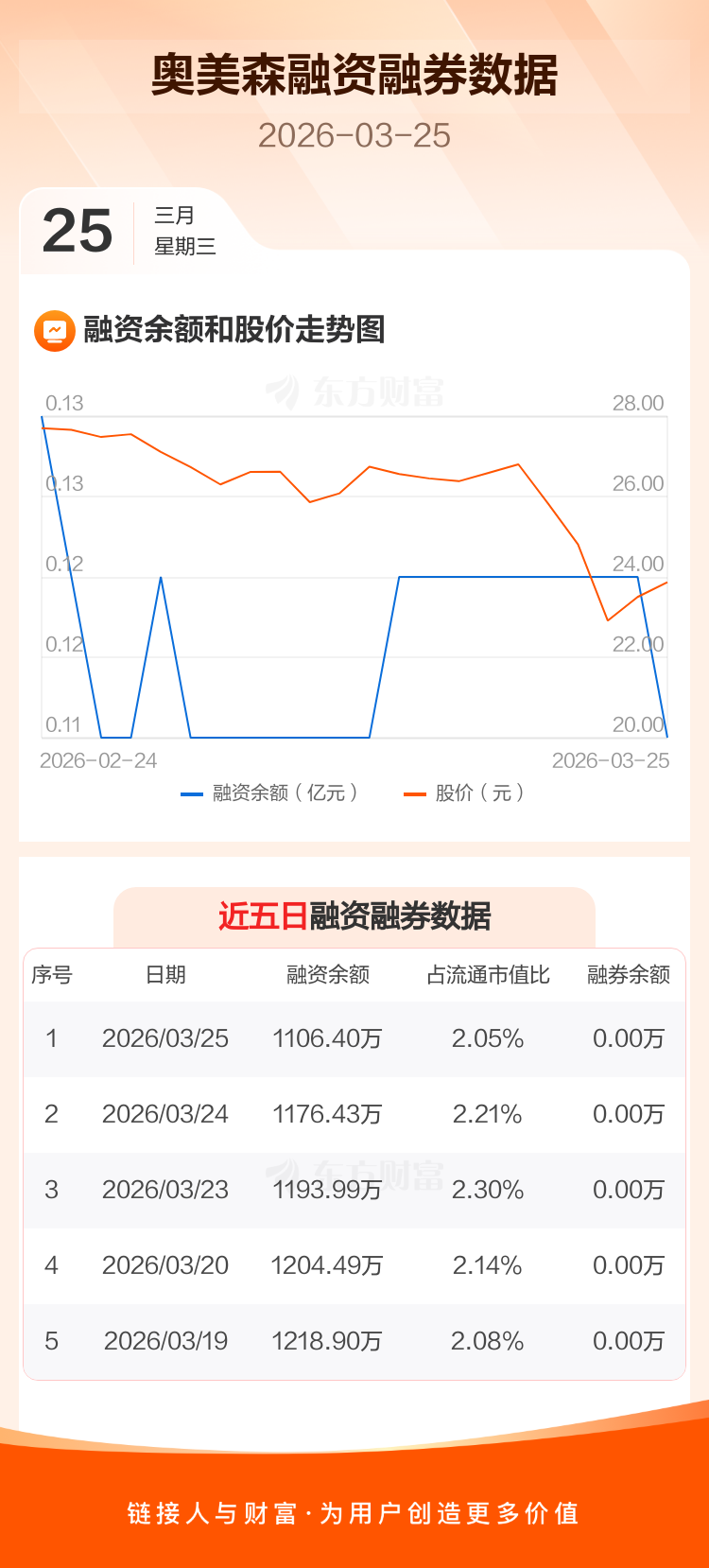 交易所最新数据显示,奥美森于2026年3月25日获融资买入40.11万元,融资偿还110.14万元,当日融资净偿还70.03万元。目前,该股融资余额1106.40万,占流通市值比例为2.05%。