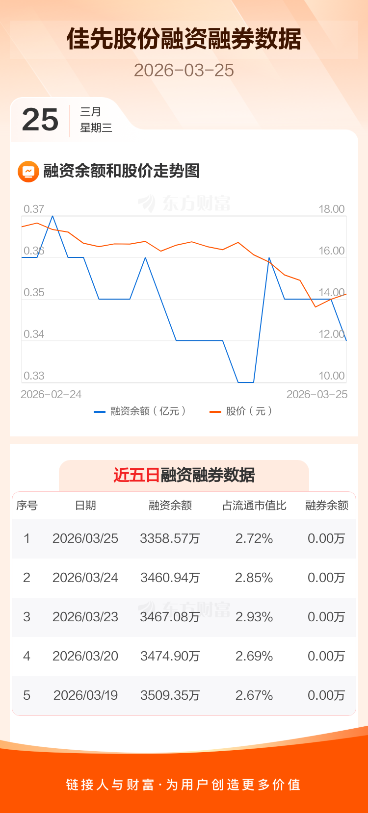 交易所最新数据显示,佳先股份于2026年3月25日获融资买入20.41万元,融资偿还122.77万元,当日融资净偿还102.37万元。目前,该股融资余额3358.57万,占流通市值比例为2.72%。