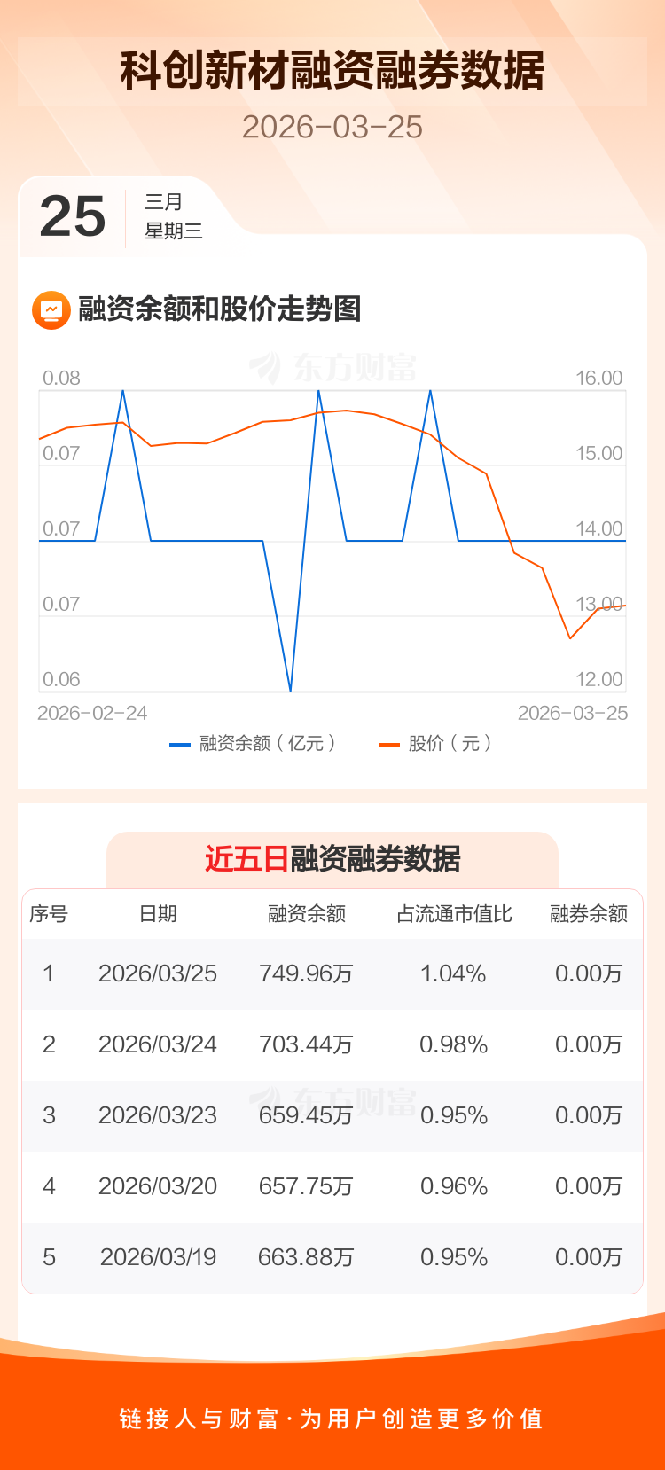 交易所最新数据显示,科创新材于2026年3月25日获融资买入152.09万元,融资偿还105.57万元,当日融资净买入46.52万元。目前,该股融资余额749.96万,占流通市值比例为1.04%。