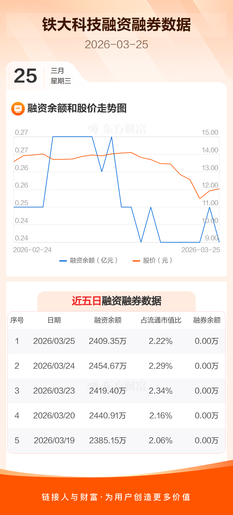 交易所最新数据显示,铁大科技于2026年3月25日获融资买入22.68万元,融资偿还68.00万元,当日融资净偿还45.32万元。目前,该股融资余额2409.35万,占流通市值比例为2.22%。