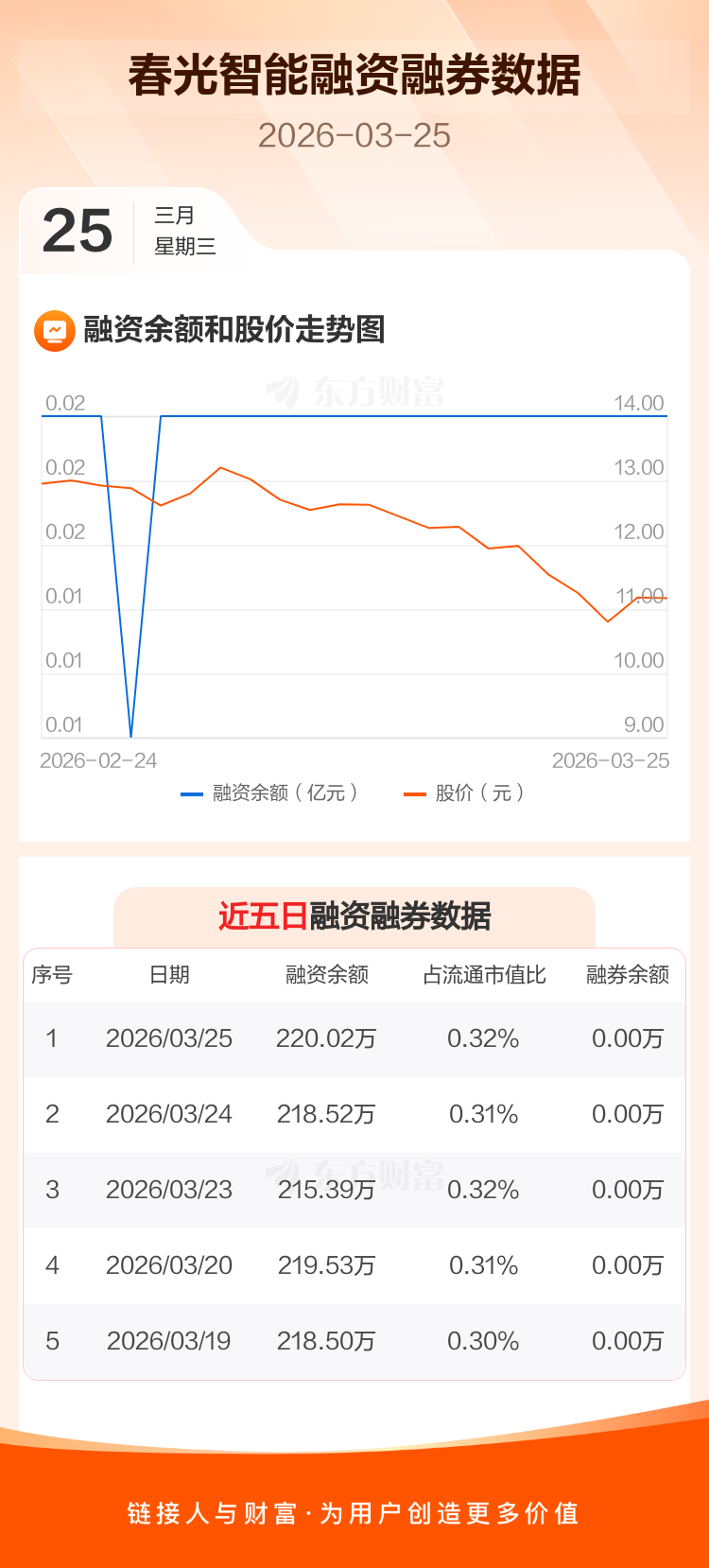 交易所最新数据显示,春光智能于2026年3月25日获融资买入6.11万元,融资偿还4.60万元,当日融资净买入1.5万元。目前,该股融资余额220.02万,占流通市值比例为0.32%。