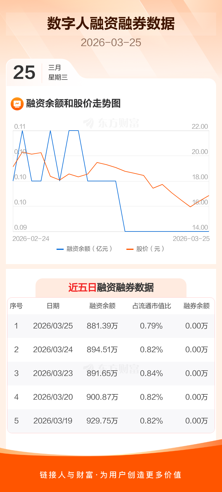 交易所最新数据显示,数字人于2026年3月25日获融资买入6.37万元,融资偿还19.49万元,当日融资净偿还13.12万元。目前,该股融资余额881.39万,占流通市值比例为0.79%。
