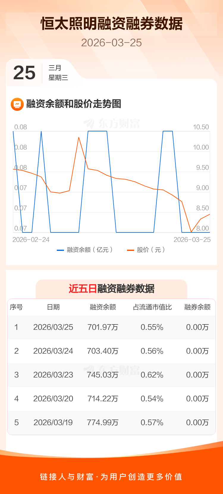 交易所最新数据显示,恒太照明于2026年3月25日获融资买入39.83万元,融资偿还41.26万元,当日融资净偿还1.43万元。目前,该股融资余额701.97万,占流通市值比例为0.55%。