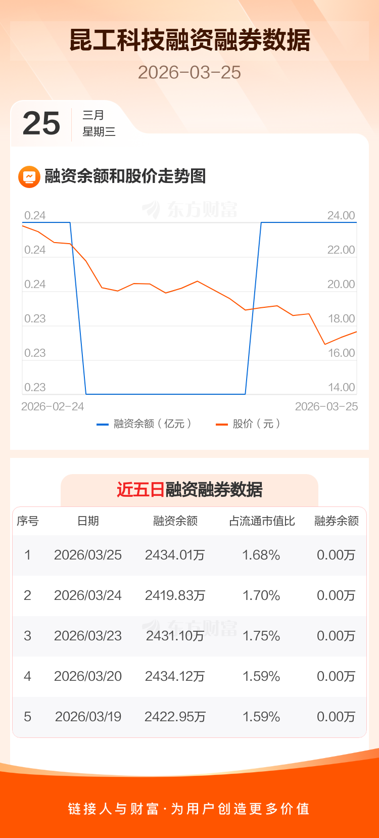 交易所最新数据显示,昆工科技于2026年3月25日获融资买入22.25万元,融资偿还8.07万元,当日融资净买入14.18万元。目前,该股融资余额2434.01万,占流通市值比例为1.68%。