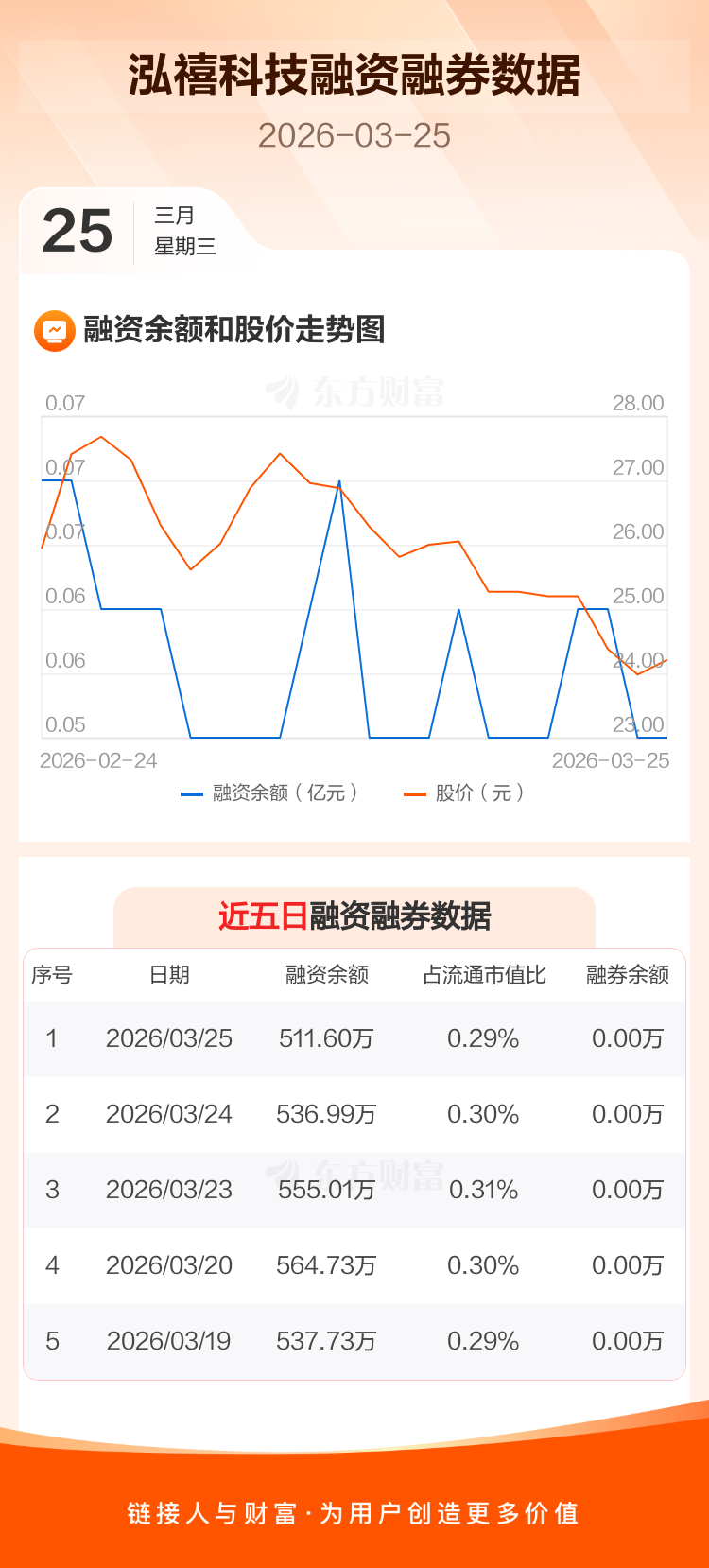 交易所最新数据显示,泓禧科技于2026年3月25日获融资买入9.50万元,融资偿还34.89万元,当日融资净偿还25.39万元。目前,该股融资余额511.60万,占流通市值比例为0.29%。