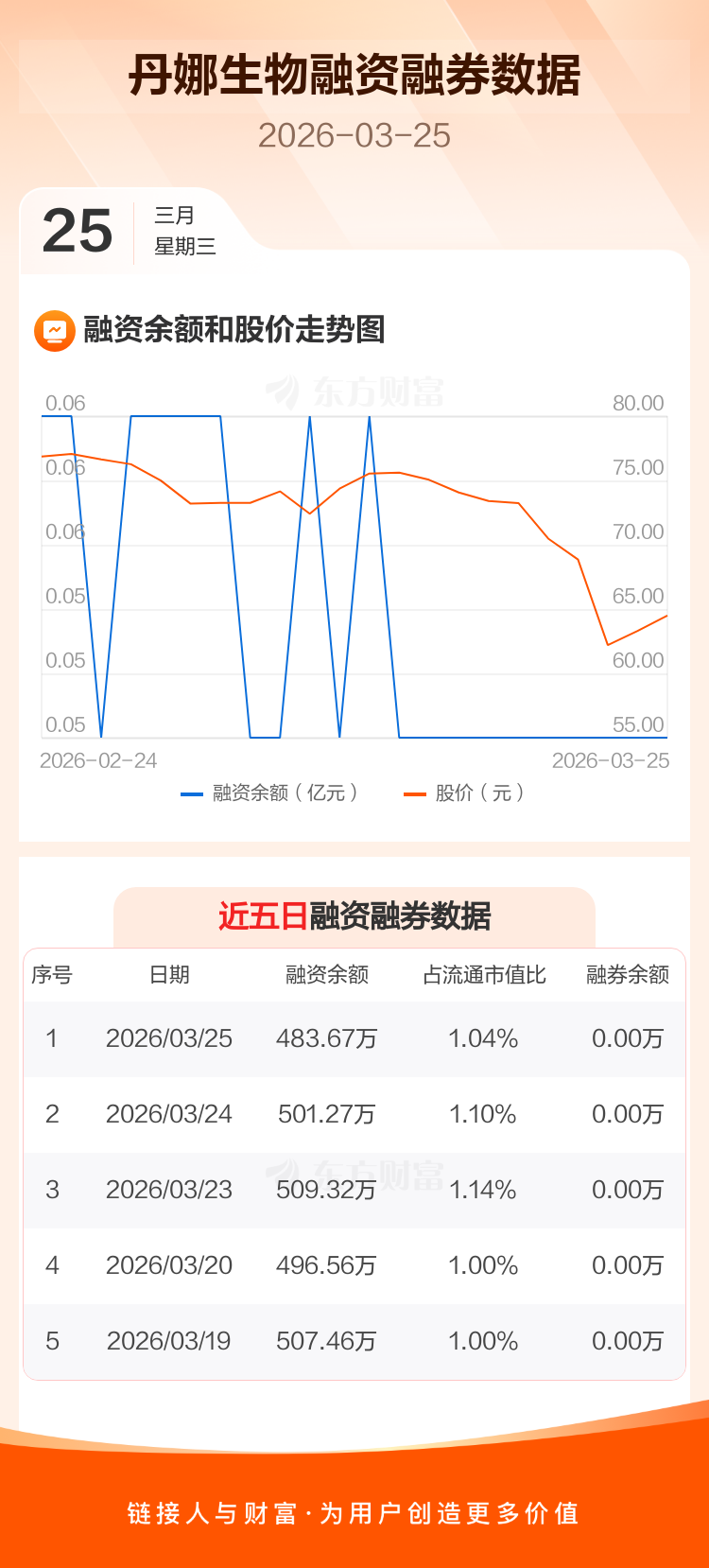 交易所最新数据显示,丹娜生物于2026年3月25日获融资买入8.02万元,融资偿还25.62万元,当日融资净偿还17.6万元。目前,该股融资余额483.67万,占流通市值比例为1.04%。